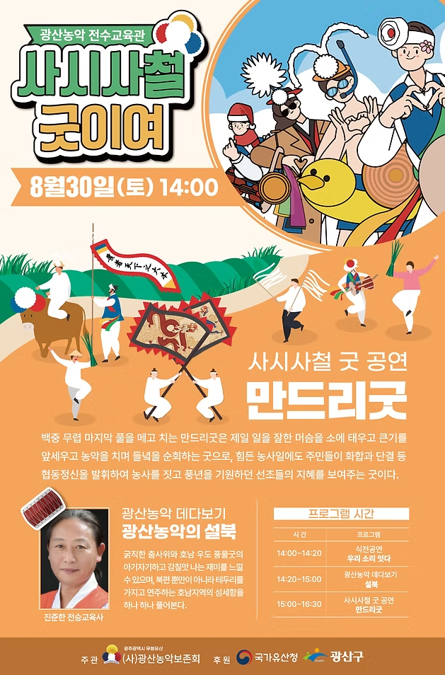 굿 공연 시간을 가지고 광산농악의 맛과 멋을 전승자의 재미있는 이야기를 통해